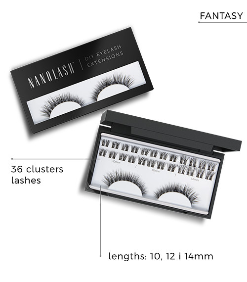 The DIY lash clusters from Nanolash ensure unsurpassed quality. The deformation-resistant, resilient structure of the lashes makes them look perfect for up to 7 days. The false eyelashes come on thin, flexible strips. The joints are completely invisible when applied to real eyelashes, so they look natural and the lash line looks visibly thicker. The case contains 36 lash clusters in three Lengths:10, 12, and 14 mm. Depending on your eye size, this is enough for 4-6 applications. Applying DIY lash clusters requires additional accessories. You can buy them separately or in a starter kit on our website.